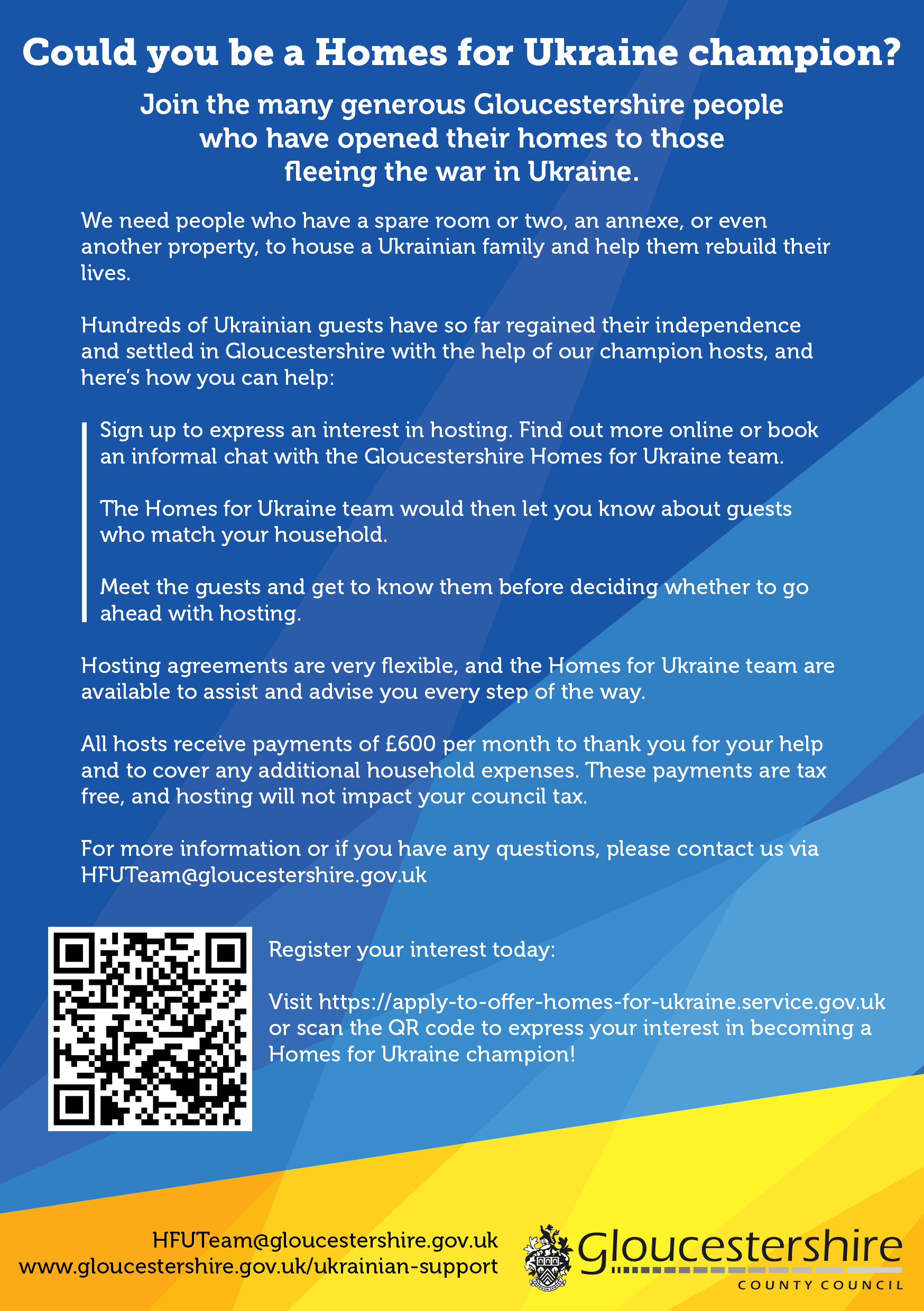 If you have a spare room you could help a refugee and receive £600 per month. Short-term placements last up to 3 months while your guests find employment and long-term accommodation. You’ll get wrap around support from the Homes for Refugees team to help you every step of the way. If you could become a Homes for Refugees host, we need to hear from you today. Please email HFR@gloucestershire.gov.uk or visitwww.gloucestershire.gov.uk/homes-for-refugees for more information.